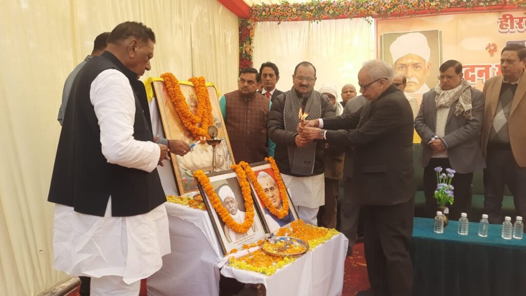 आजमगढ़। कंधरापुर स्थित मदन मोहन मालवीय इंटर कॉलेज की हीरक जयंती 25 दिसंबर गुरुवार को धूमधाम से मनाई गई। कार्यक्रम मैं पहुंचे मुख्य मुख्य अतिथि उप्र चीनी मिल संघ के उप सभापति ऋषिकांत राय ने कॉलेज परिसर में स्थापित पंडित महामना मदन मोहन मालवीय के प्रतिमा पर माल्यार्पण व पौधारोपण कर कार्यक्रम की शुरुआत की। उसके पश्चात मंच पर पहुंच मां सरस्वती के चित्र पर माल्यार्पण व दीप प्रज्वलित करने के साथ ही मालवीय जी व पूर्व प्रधानमंत्री अटल बिहारी वाजपेई के चित्र पर पुष्प चढ़ा उन्हें श्रद्धा सुमन अर्पित किया।